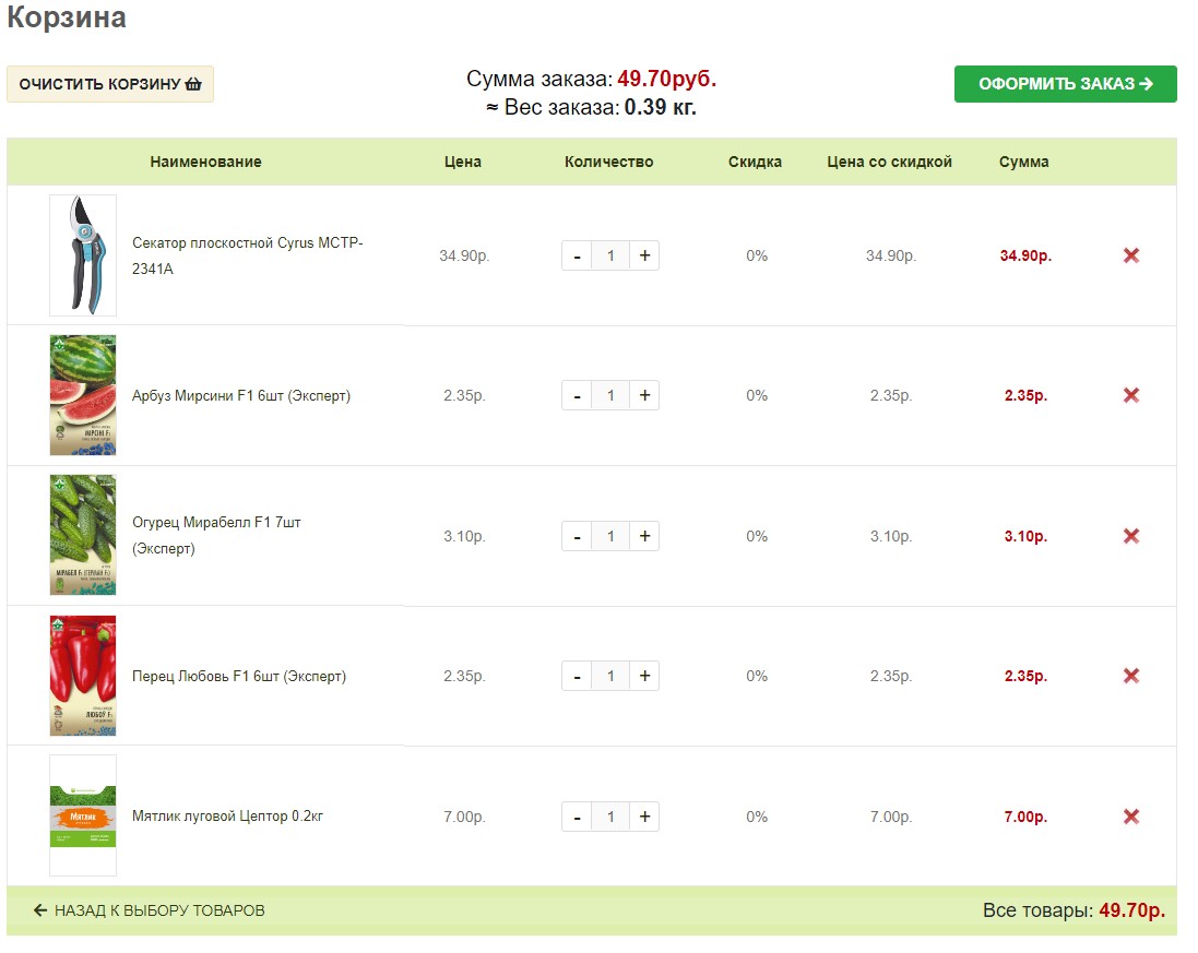 Вы находитесь в корзине. Проверьте список Ваших покупок, вес и сумму заказа. При необходимости отредактируйте количество товара, удалите лишние позиции либо дополните корзину вернувшись к выбору товаров. Для оформления заказа нажмите зелёную кнопку "Оформить заказ".